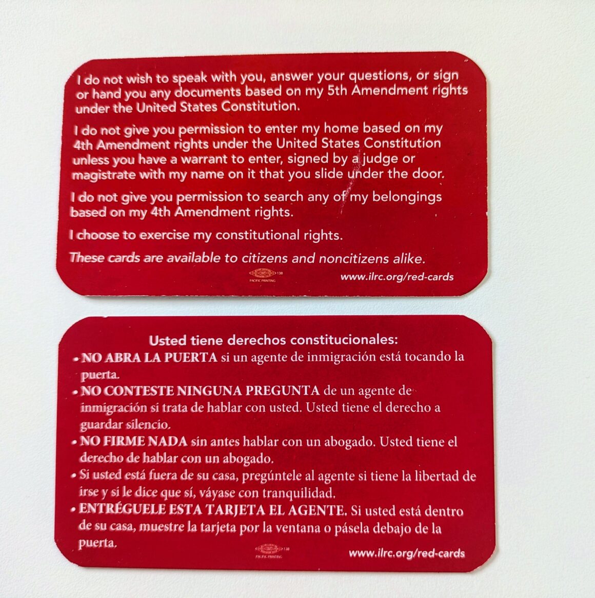 The Red Card is a small card, like an oversized business card or small playing card, printed in Spanish on one side, English on the other.