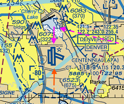 • The permanent landscape. Our destination was Centennial Airport, in Denver, airport code KAPA. Centennial is a very busy, very nice, “reliever” airport on the south side of Denver, near Aurora. It has two big, parallel north-south runways, plus a smaller runway at an east-west angle.Centennial’s big runways, and its relatively flat-land location, make it attractive for aircraft ranging from little piston airplanes like ours to sizable jets. But the airport works within a narrow band of constraints, in this sense: